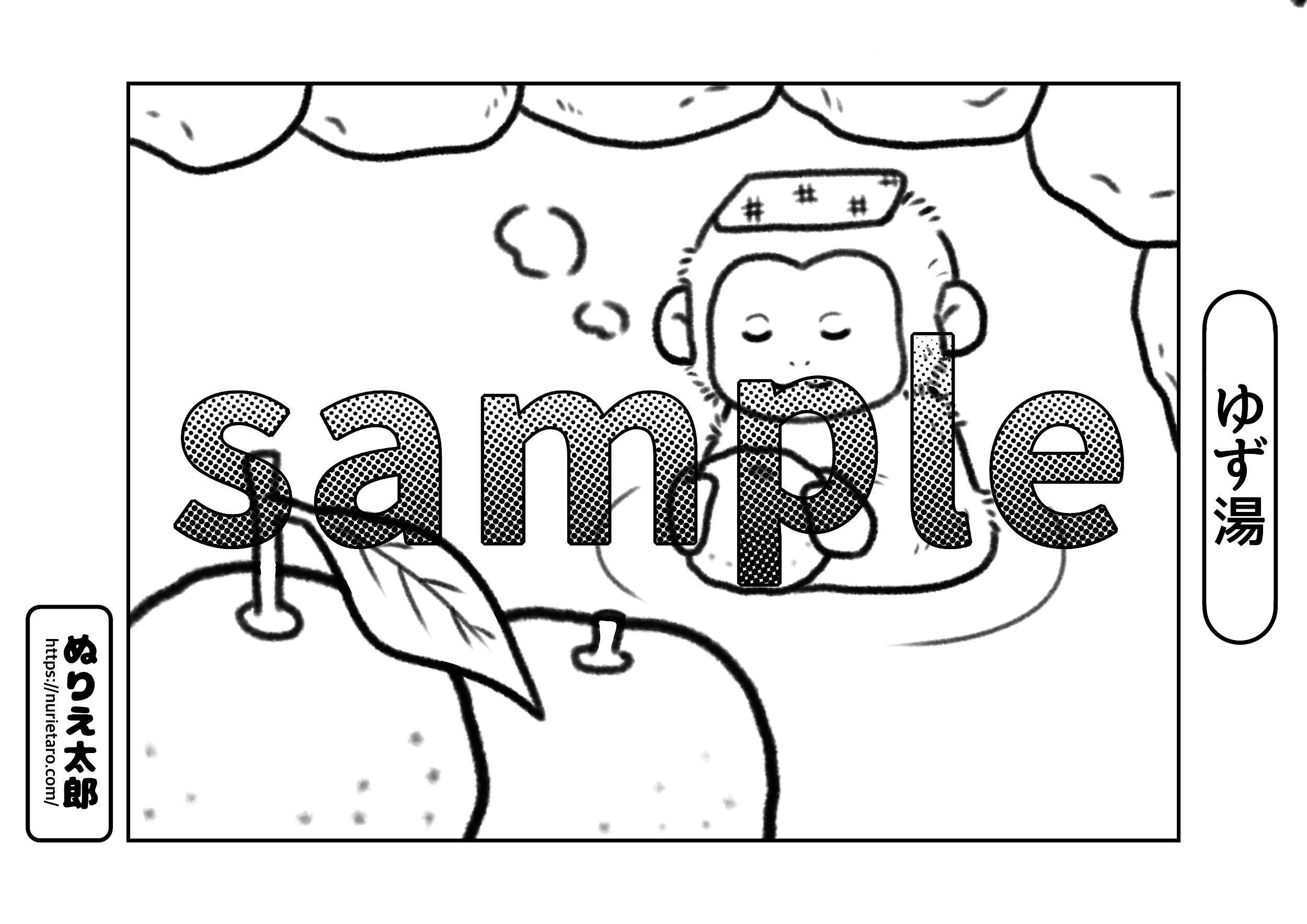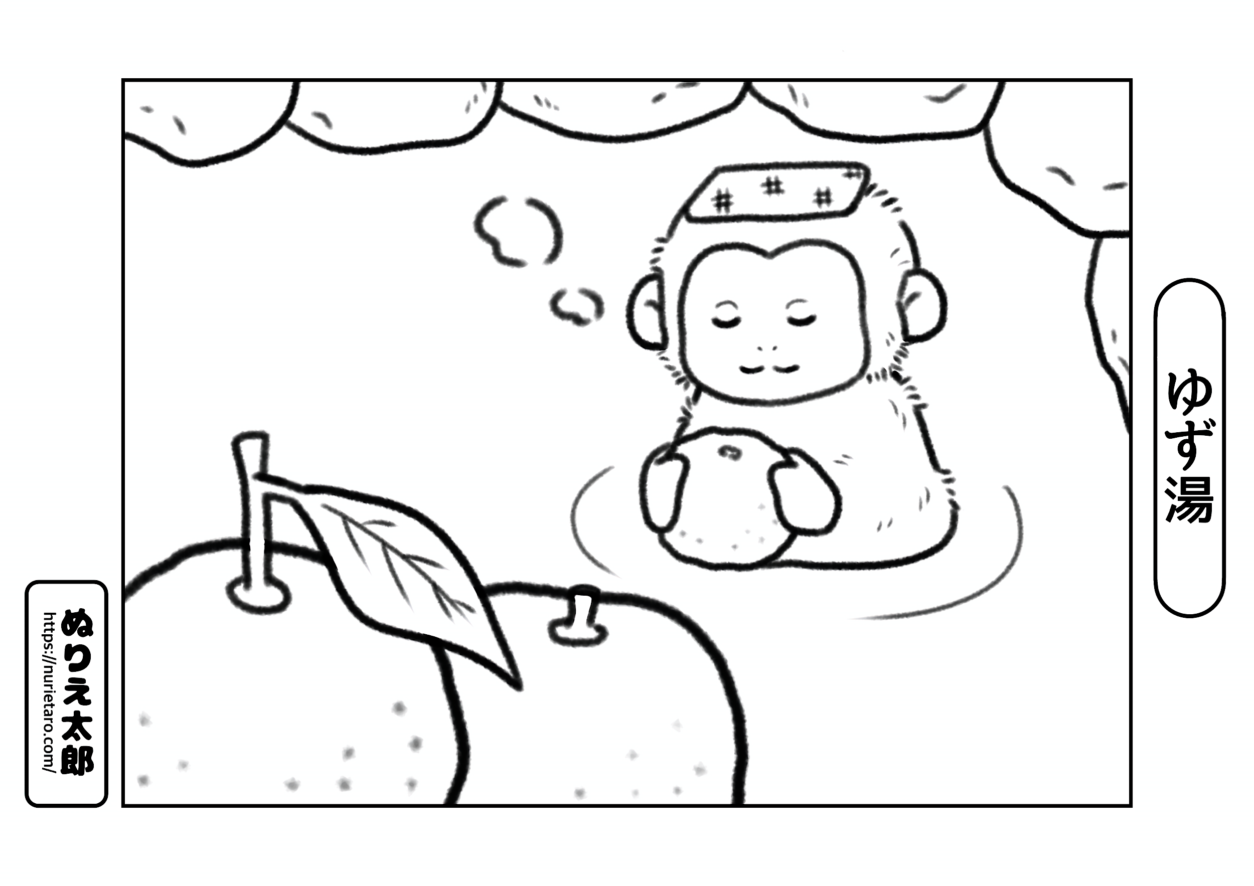 ゆず湯と猿 12月 2025/11/24 今回はゆず湯に浸かるお猿さんの塗り絵です♪ 実は日本で温泉に入るのは長野県のニホンザルだけだとか…! 海外では”snow monkey”として人気があるそうです^ ^